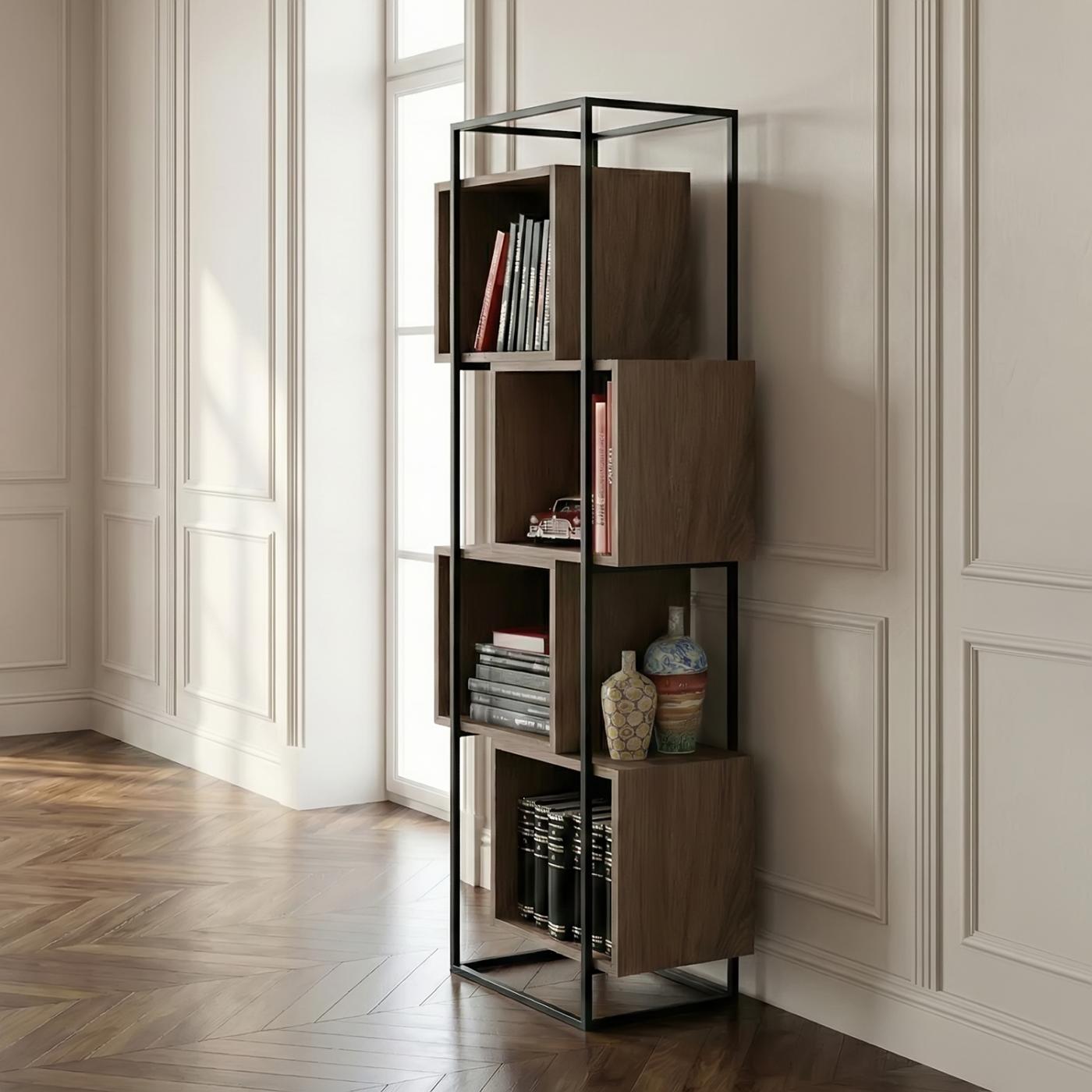 Етажерка «Геометрія» відразу привертає увагу до себе завдяки нестандартному дизайну. Чотири секції асиметрично розміщені всередині металевого каркасу, при цьому вони ніби парять у повітрі. Це оригінальні меблі, що матимуть вдалий вигляд у сучасному інтер’єрі.