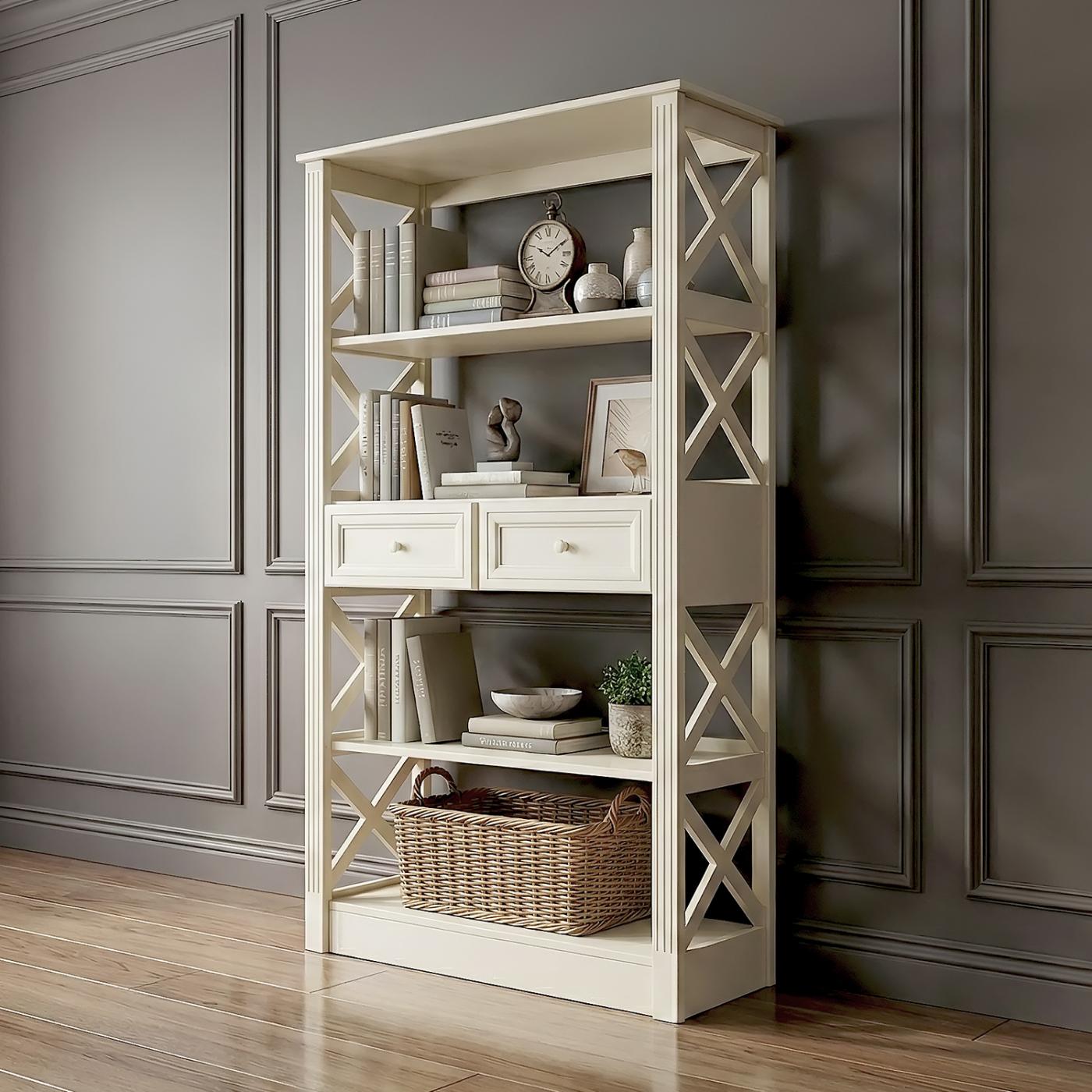 Етажерка "Прованс" - функціональний предмет. що призначений для зберігання речей у вільному доступі. Її також можна використовувати для розділення велокої кімнати на окремі зони Широкі полиці чудово підходять для книг, кімнатних квітів, світлин у рамках, предметів декору тощо Завдяки наявності двох шухляд тут можна зберігати й особисті дрібнички.