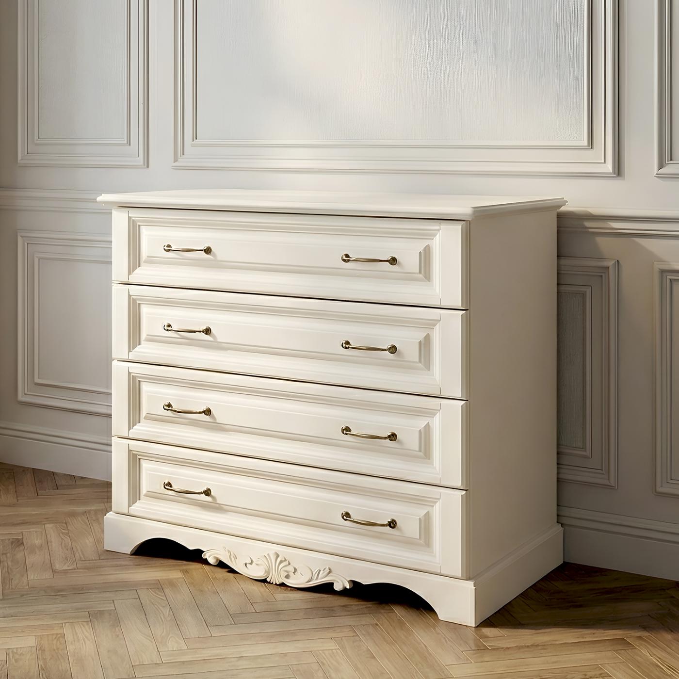 Вишуканий комод «Прованс» від української меблевої студії «Еклектика» прикрасить спальню з класичним інтер’єром. Модель відрізняється елегантним дизайном. Меблі мають характерні для цієї колекції стилістичні атрибути: днище з криволінійними вирізами в класичній манері, рельєфне фрезерування фасадів в окантовці, стільниці з витонченим профілюванням торця.