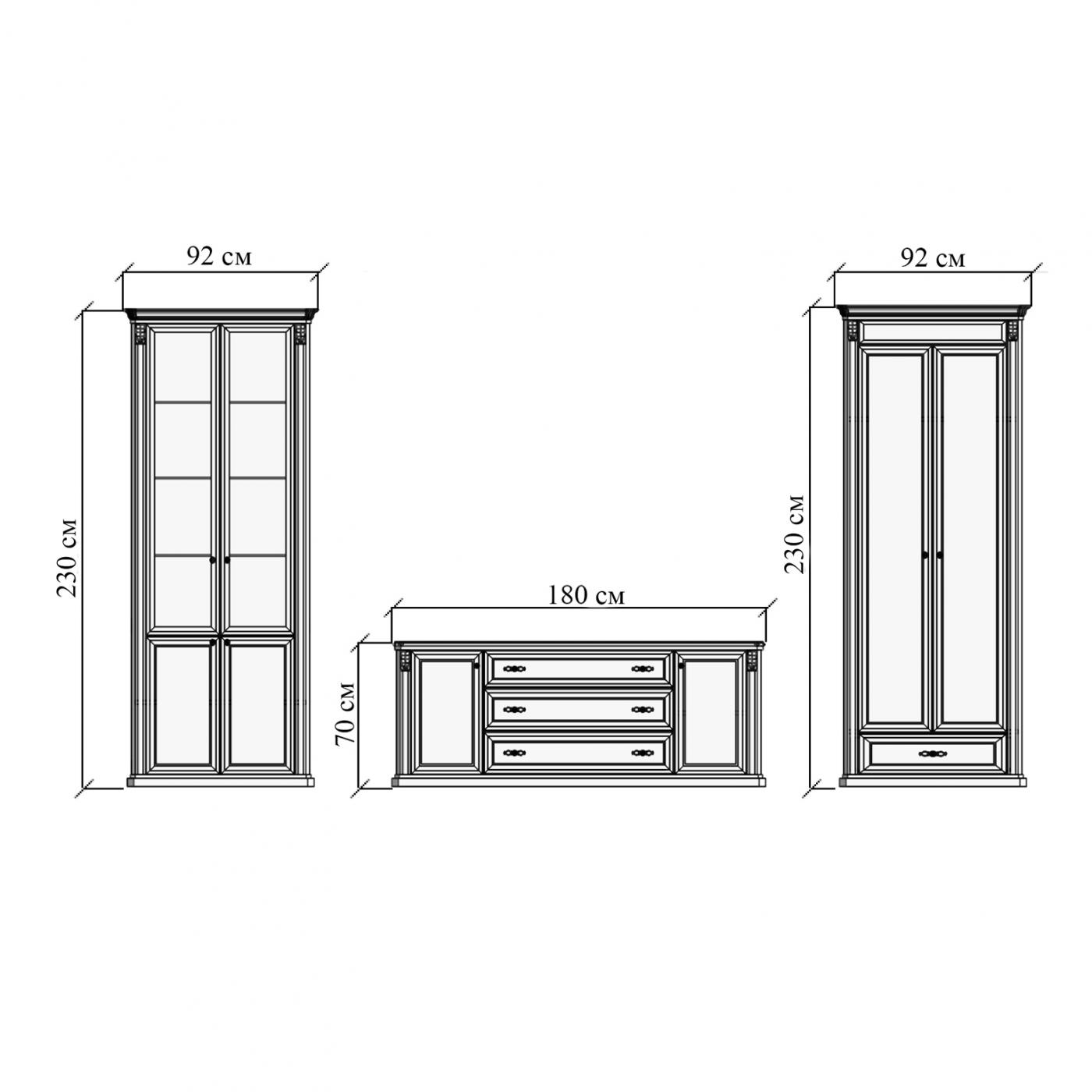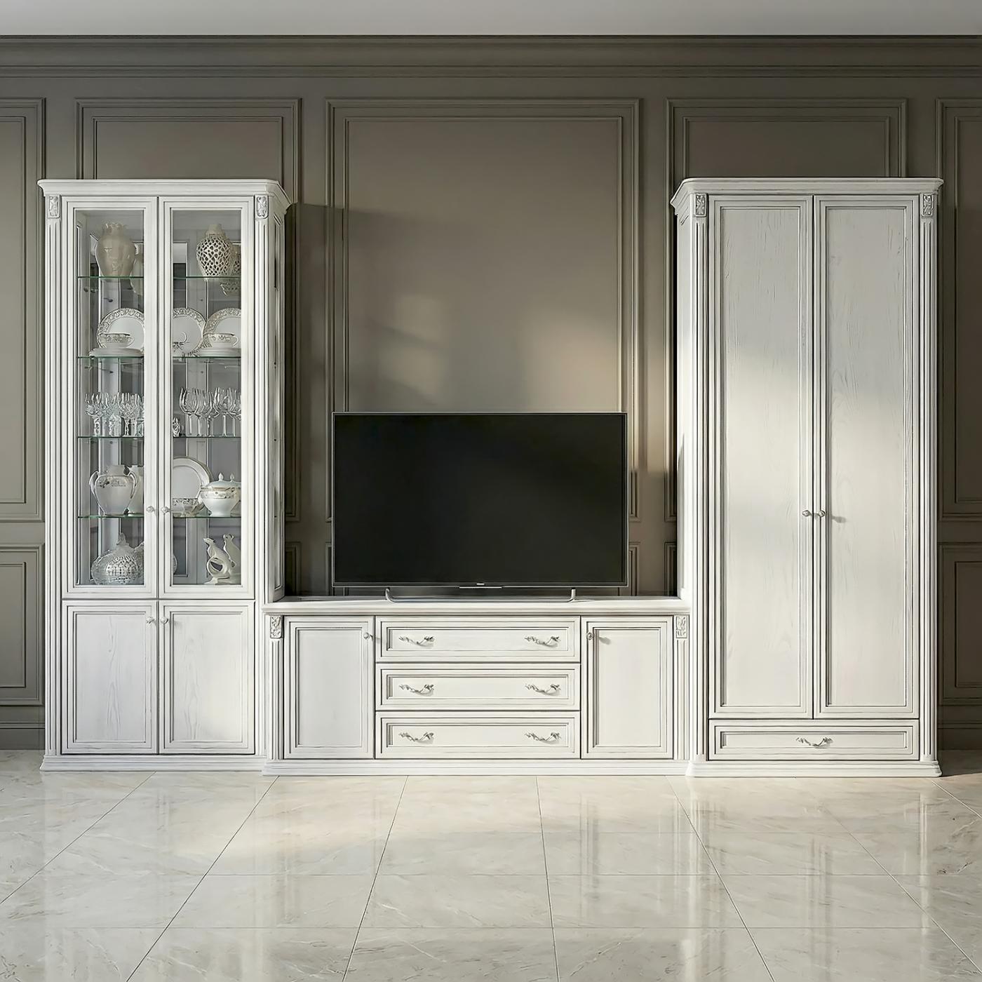 Комплект мебели «Сиена» - эстетическое решение для гостиной небольшого размера, оформленной в класическом или современном стиле. Идеальное сочетание между собой достигается благодаря одинаковым стилистическим особенностям и материалам. В комплект входит витрина со стеклянными дверями, вместительная тумба под телевизор и небольшой шкаф. Все предметы изготовлены из высокачественног дерева: естественная красота фактуры материала хорошо видна благодаря окрашиванию в светлые цвета. Эстетику мебели дополняют итальянские ручки, карнизы и цоколи со сложной формой профиля.