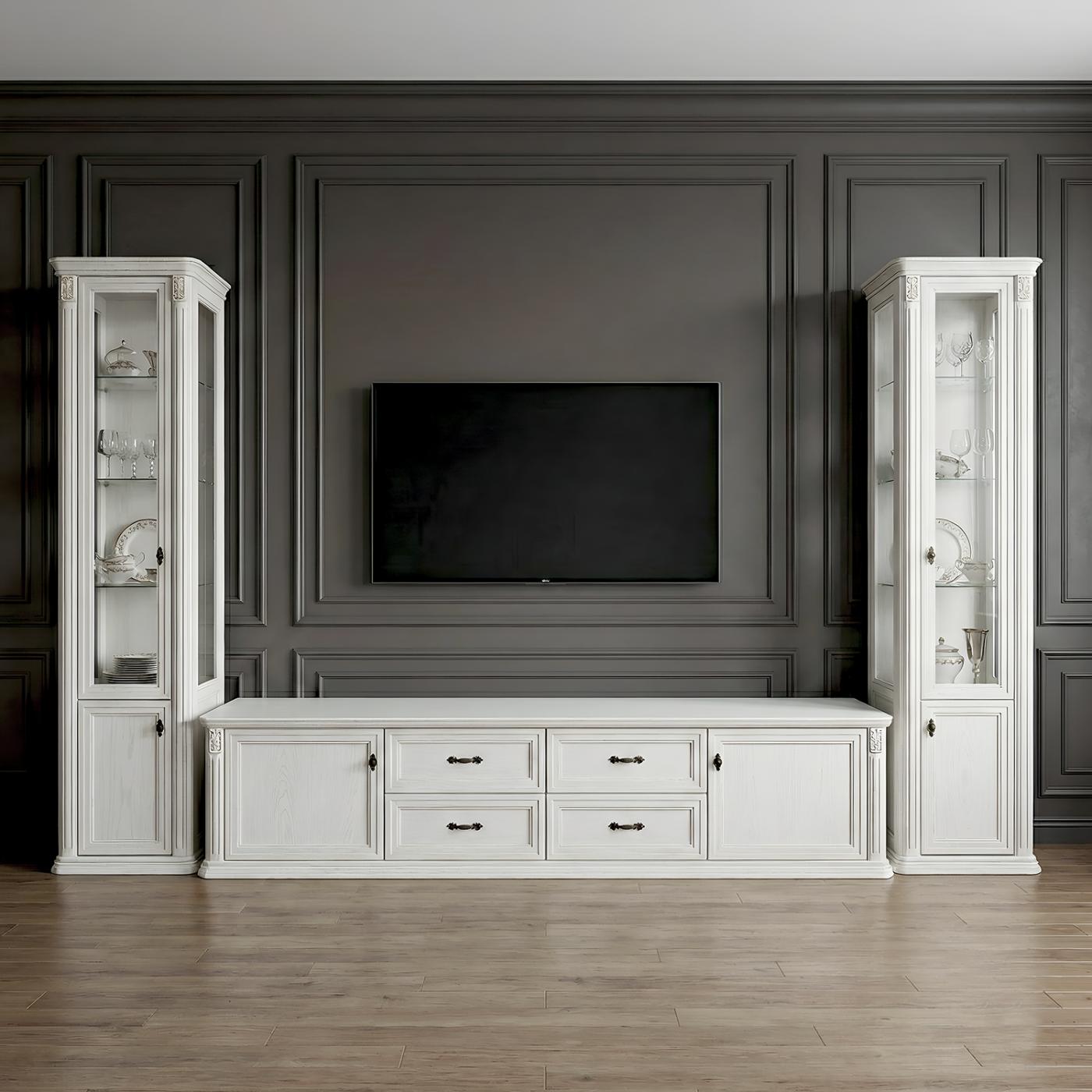Современная классика из массива дерева ясень. Придется по вкусу ценителям всего натурального в интерьере, а природная красота дерева дополнена элегантной фурнитурой. Наличие осткеклённых секций в витринах позволит расставить красивую посуду или разместить памятные сувениры. За глухими фасадами могут хранится книги и другие полезные мелочи. Просторная ТВ тумба содержит четыре выдвижных ящика, а также две секции с распашными фасадами.