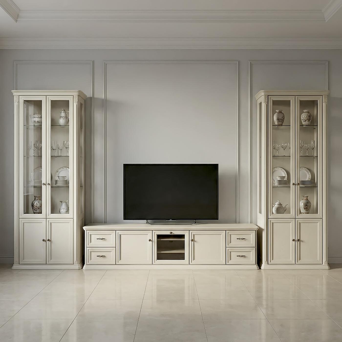 Данный комплект мебели для гостиной - это уникальное сочетание красоты, вместительности и функциональности. Оригинальные фасады с граненным остеклением и глухими секциями смотрятся невероятно стильно. Мебель выполнена в светлых тонах, природный узор древесины проявлен оригинальной фрезеровкой фасадов и резными элементами декора. ТВ тумба содержит четыре выдвижных ящика и две секции с распашными фасадами. Центральная секция оснащена полками для размещения аппаратуры.