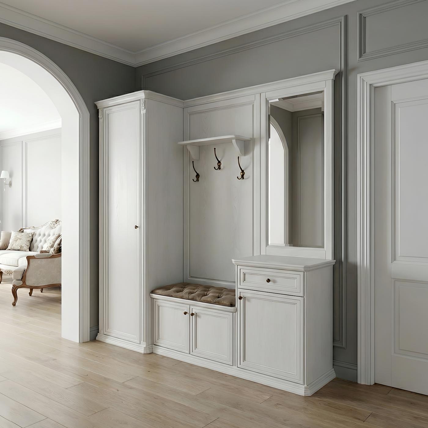 Меблі для прихожої виготовлені з натурального дерева, тому відрізняються міцністю та довговічністю. Основні стилістичні атрибути комплекту — багатоступінчасті фільонки на фасадах, помітний цоколь, пілястри на боковинах шафи, дорога фурнітура італійського виробництва.