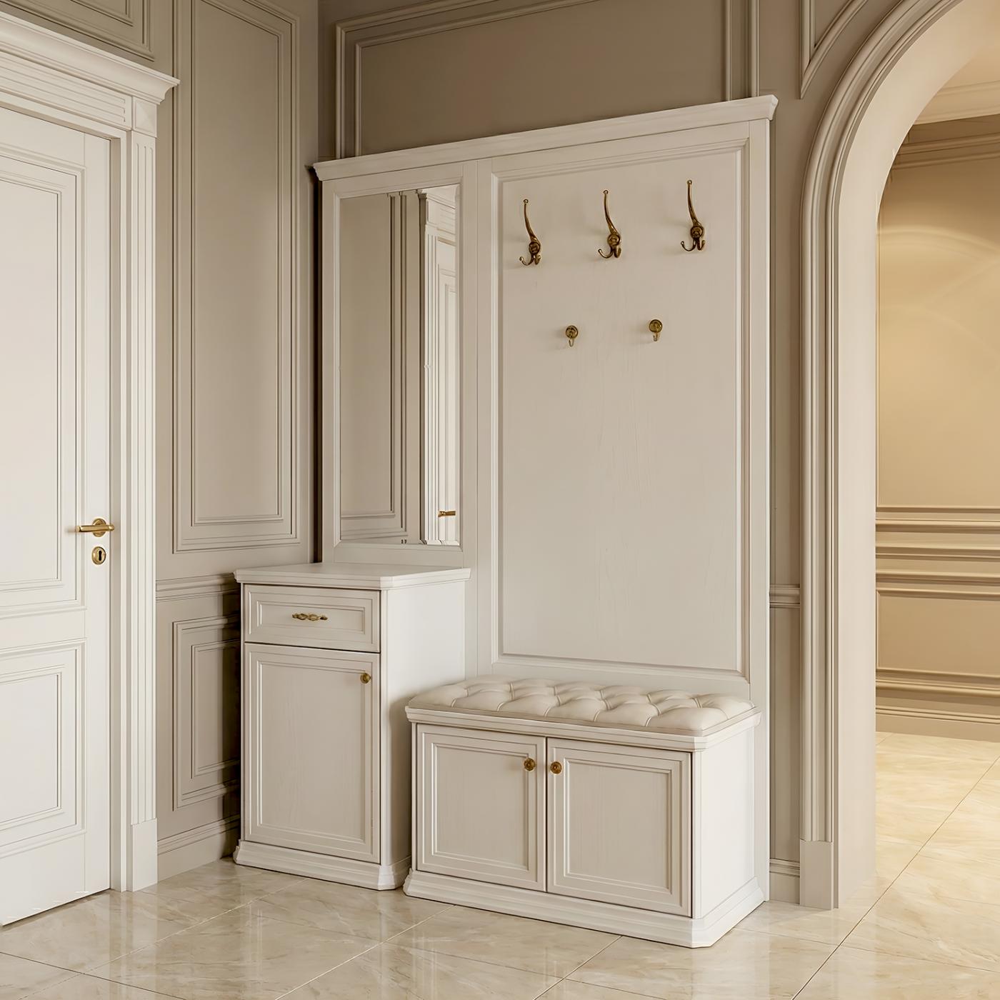 Типовой комплект мебели в прихожую серии «Сиена». Базовая ширина подобрана, исходя из популярности запросов клиентов. Панель скрючками предназначена для хранения повседневной одежды. Тумба под обувь с мягкой подушкой, для удобства эксплуатации. Панель с зеркалом - самый необходимый предмет мебели в прихожей. Тумба с ящиком это универсальное решение, в ней помимо обуви можно хранить средства по уходу за обувью.