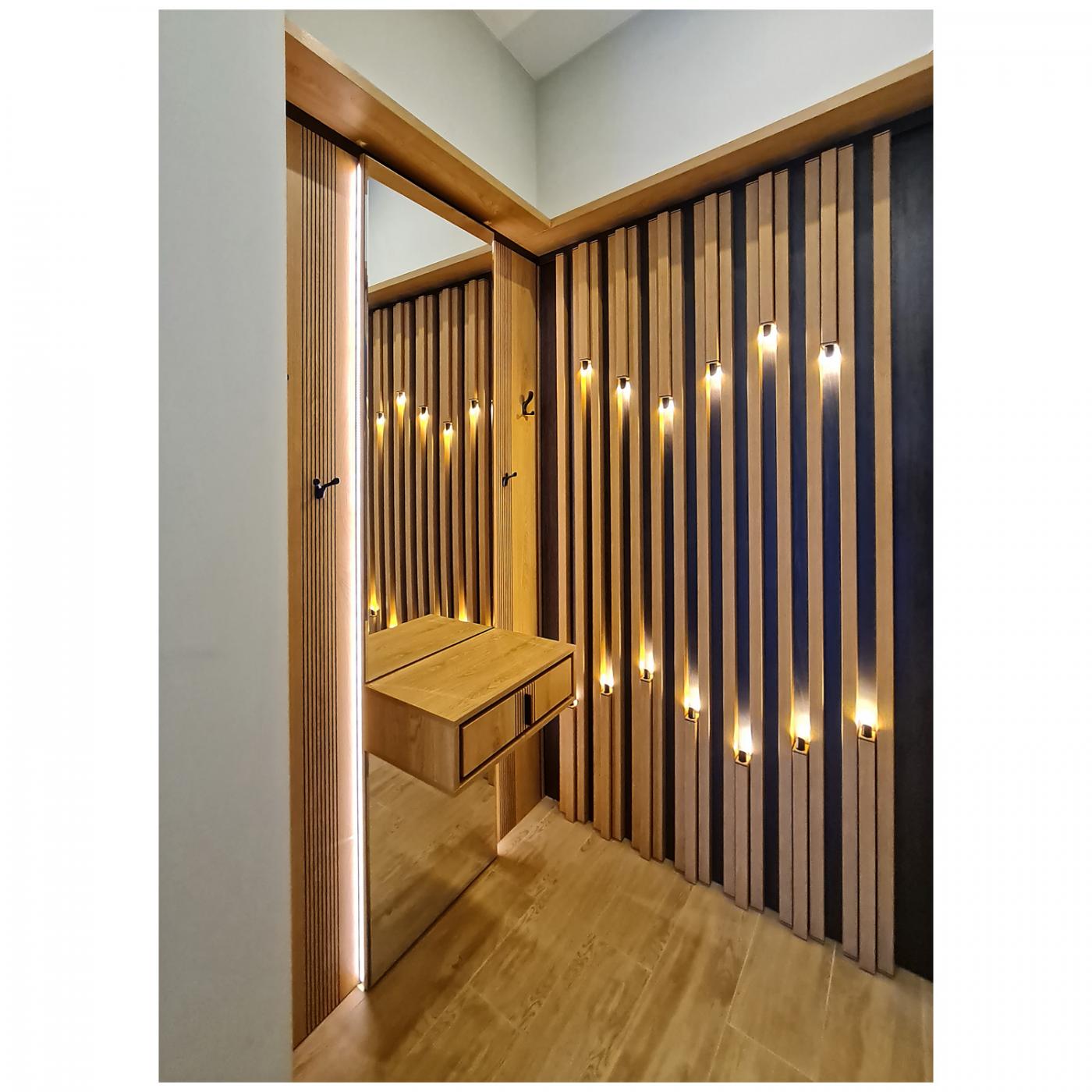Панель с подсветкой "Геометрия" выполнена из качественной ламинированной плиты "Egger" Австрия. Благодаря своей конструкции дает возможность поглащать звуки, уменшить отражения и улучшить акустику в помещении. Также панель дает возможность спрятать неровности стен и комуникации. На выбор есть несколько базовых темных и светлых цветов материала.