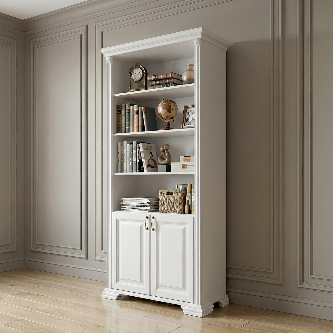 Четыре одинаковых открытых полки комфортной высоты и глубины – достаточно для домашней библиотеки, тем более, что в нижней, закрытой распашными дверьми, секции есть еще полки для томов, которых лучше скрыть от посторонних глаз.