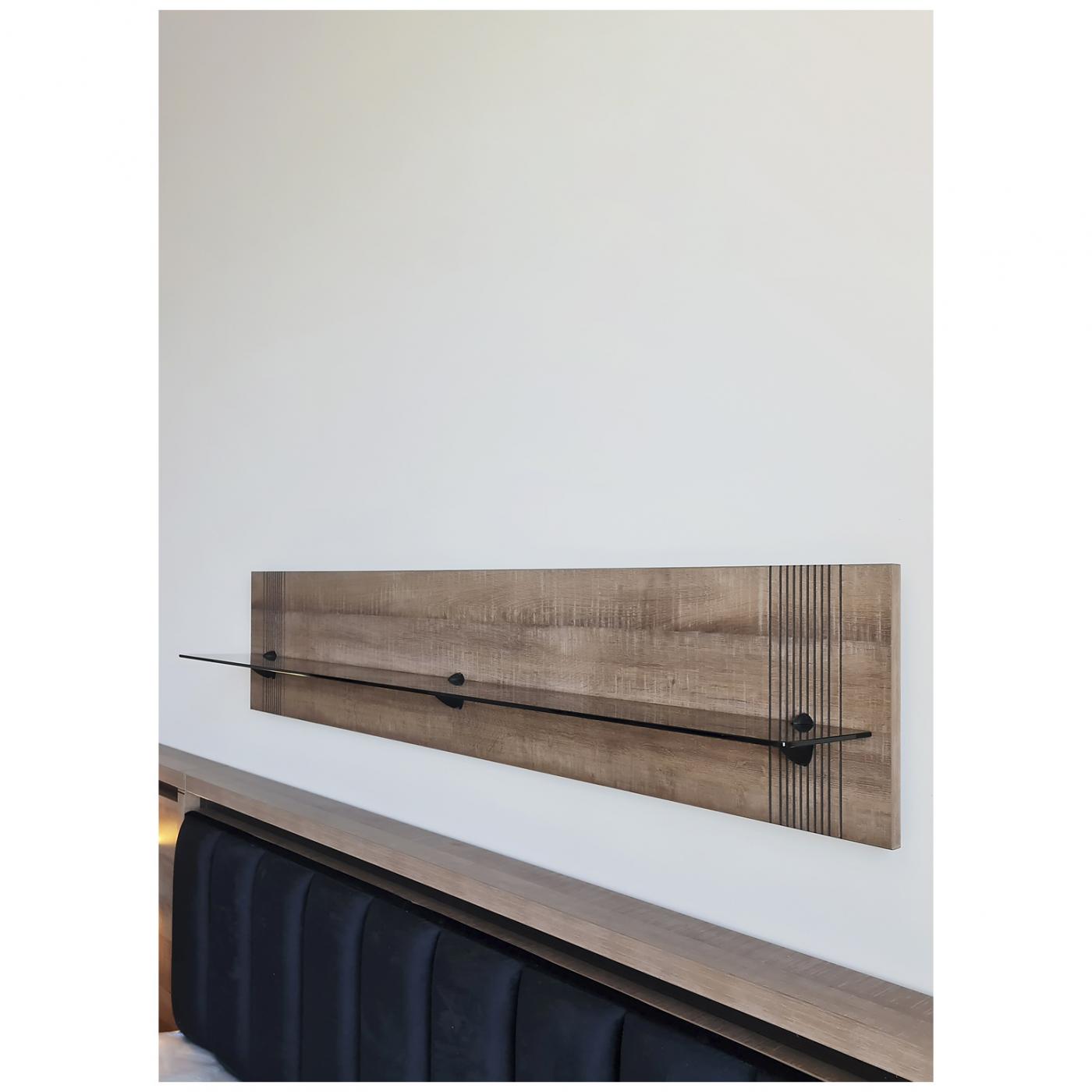 Довга прямокутна панель, що кріпиться до стіни, виготовлена з ламінованої ДСП Egger (Австрія). Її прикрашають лише кілька вертикальних смужок із двох сторін. Горизонтальна полиця зроблена із загартованого тонованого скла та прикріплена до дерев’яної панелі фурнітурою Hafele (Німеччина). Розміри виробу — 150 х 20 х 30 см (Д/Г/В).