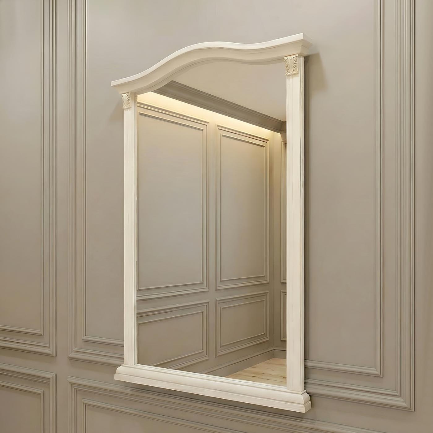 Боковые планки, как античные колонны, декорированы пилястрами с каннелюрами. Все это великолепие увенчано капителями с мелким резным рисунком и накрыто карнизом с изящным изгибом в традициях оформления дворцовых фронтонов. Нижняя планка с зеркальным профилем, но прямая.