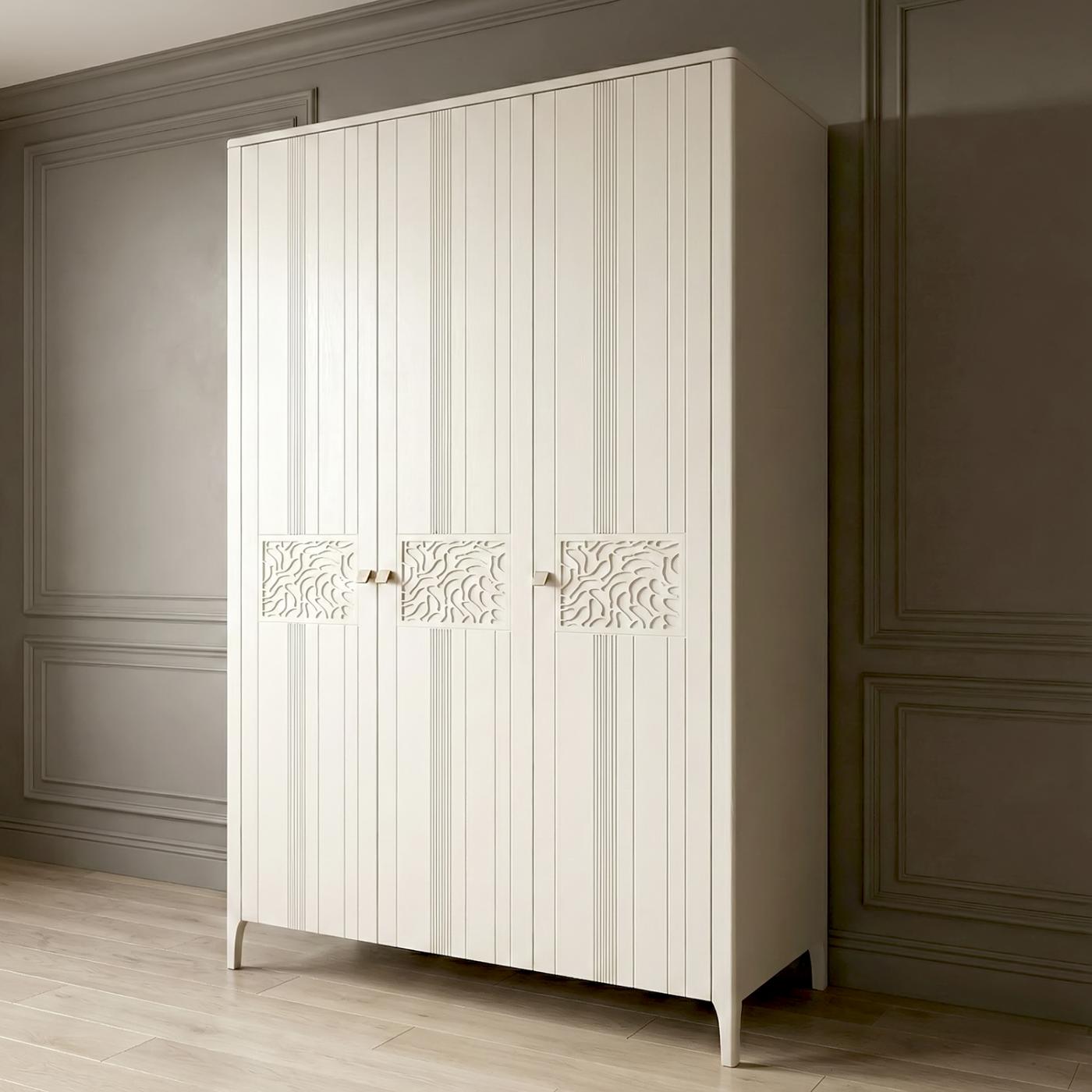 Стильна мінімалістична шафа «Доміно» — прекрасний варіант для спальні. Модель містка, зручна у використанні та має вишуканий дизайн. У цій шафі є стилістичні штрихи, які можна побачити у всій колекції меблів «Доміно» від української студії «Еклектика». Фрезерування на фасадах створює правильні акценти й робить шафу оригінальною та привабливою.