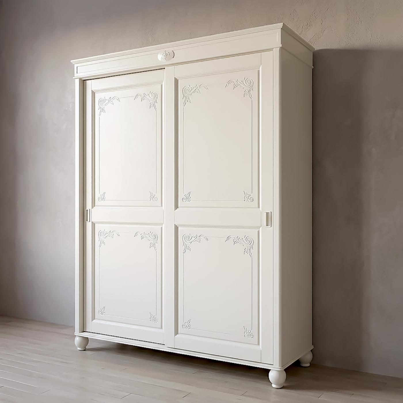 Шафа-купе «Сієна-Конфетті» — бездоганна стилістично. У цьому виробі поєднуються старовинні меблеві прийоми та сучасні тенденції. Майстри студії вдало використали зручність розсувних систем і багатовікові традиції малих архітектурних форм. Фасади привертають увагу завдяки оздобленню у вигляді акуратної ступінчастої обкладки. Периметр оформлений різьбленим малюнком із вензелями по кутах. Предмет солідний на вигляд через масивний респектабельний карниз.