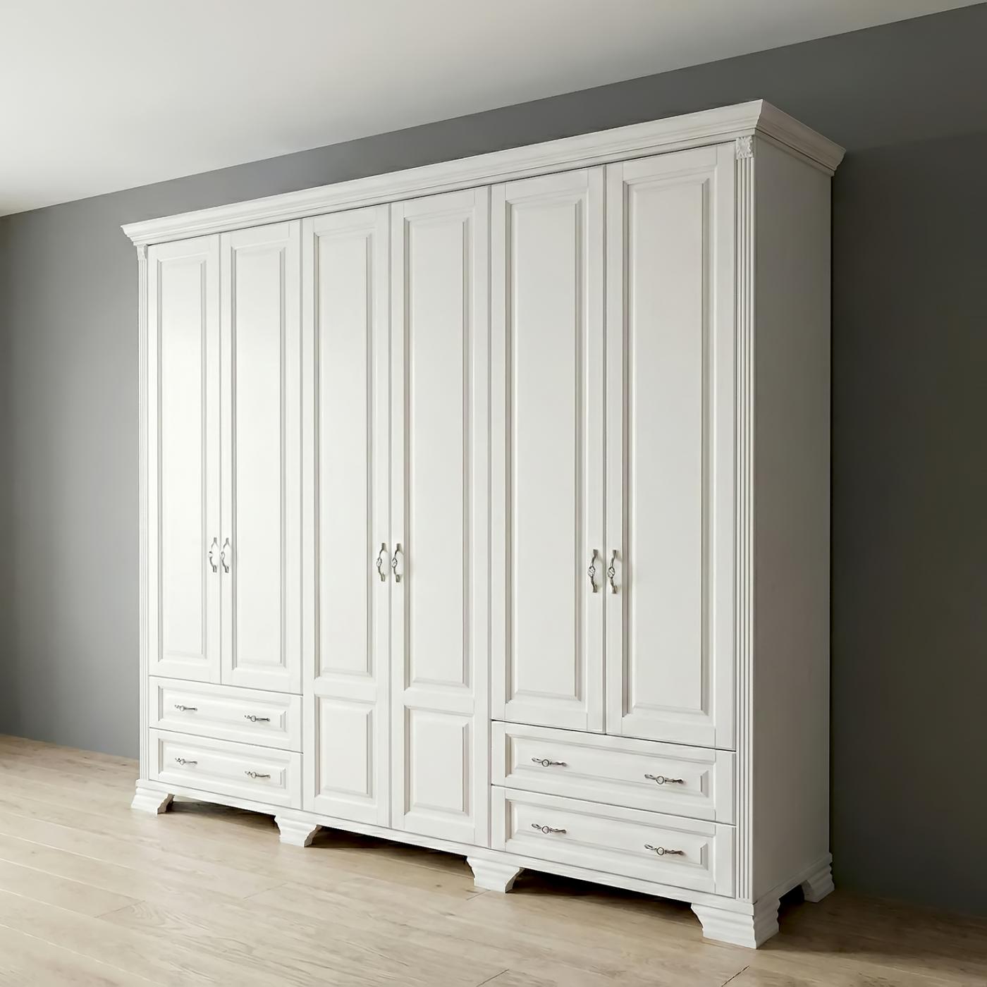 Шафа «Магія» виготовлена з якісного дерева та покрита тонким шаром емалі. Класичний дизайн меблів має цікаві стилістичні атрибути. Модель прикрашають пілястри з лініями-канелюрами, капітелі з тонким різьбленим орнаментом, солідний фрезерований карниз. Шафа стоїть на цокольних опорах, виконаних у традиціях старовинних меблів.