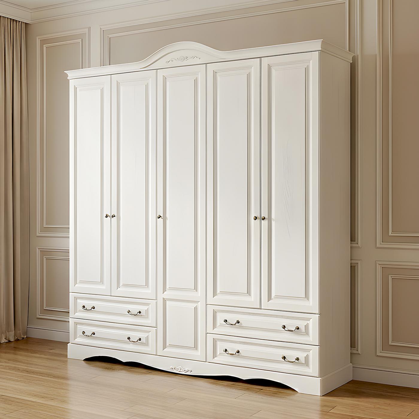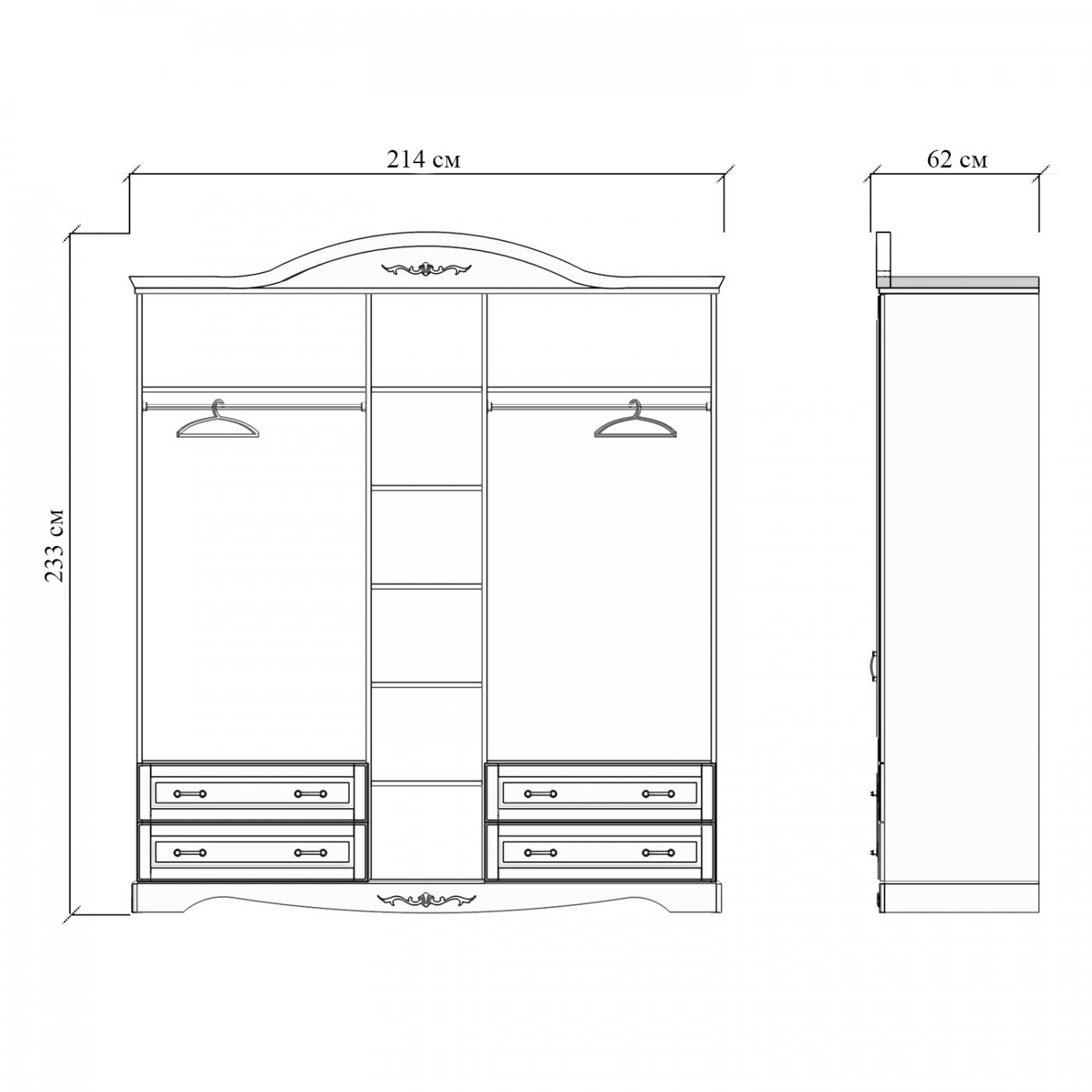 Шафа у класичній манері, що характерна для французьких гардеробів. Вона має карниз складної форми з вишуканим фронтоном. у центрі якого передбачений різьбленний орнамент. Також привертає увагу цоколь із вигадливим вирізом, який є традиційним для меблів у стилистиці провансу. фасади виділені фільонкою зі складним рельєфом.