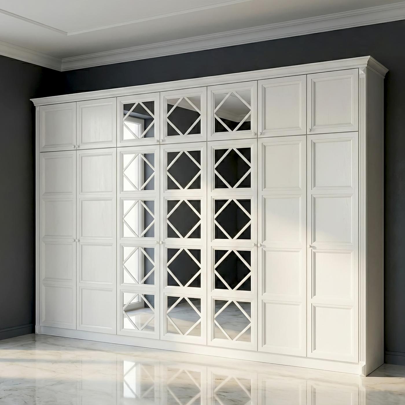 Шафа для прихожої виготовлена з якісного та екологічно безпечного матеріалу — натурального дерева. Меблі відрізняються цікавим дизайном у стилі сучасної класики. Центральна частина шафи особливо привертає увагу: дзеркальний фасад розділений на квадрати, в кожному з яких є перехрещені дерев’яні елементи.