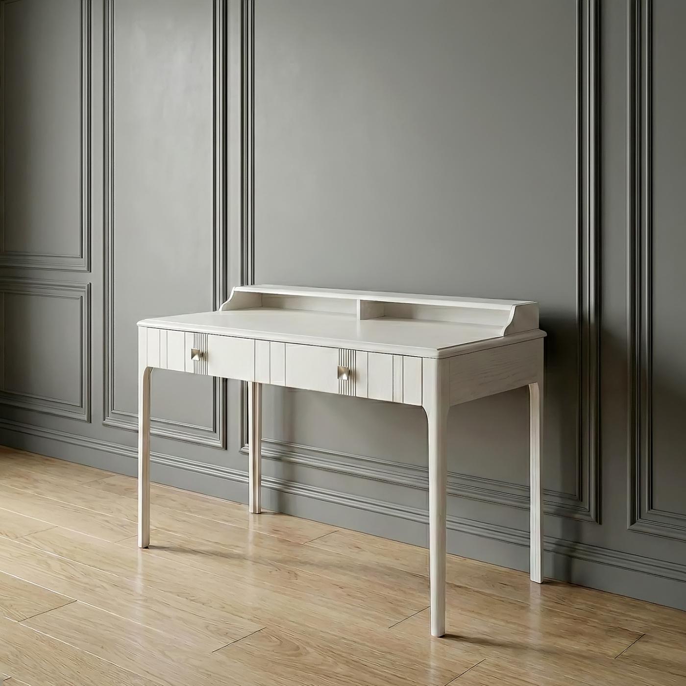 Письмовий стіл «Доміно» має стилістичні штрихи, як у всій однойменній колекції меблів. Модель виділяється завдяки високим тонким ніжкам-опорам, стільниці зі складним фрезеруванням кромки, вертикальним лініям на фасаді та незвичайним металевим ручкам у вінтажному стилі.
