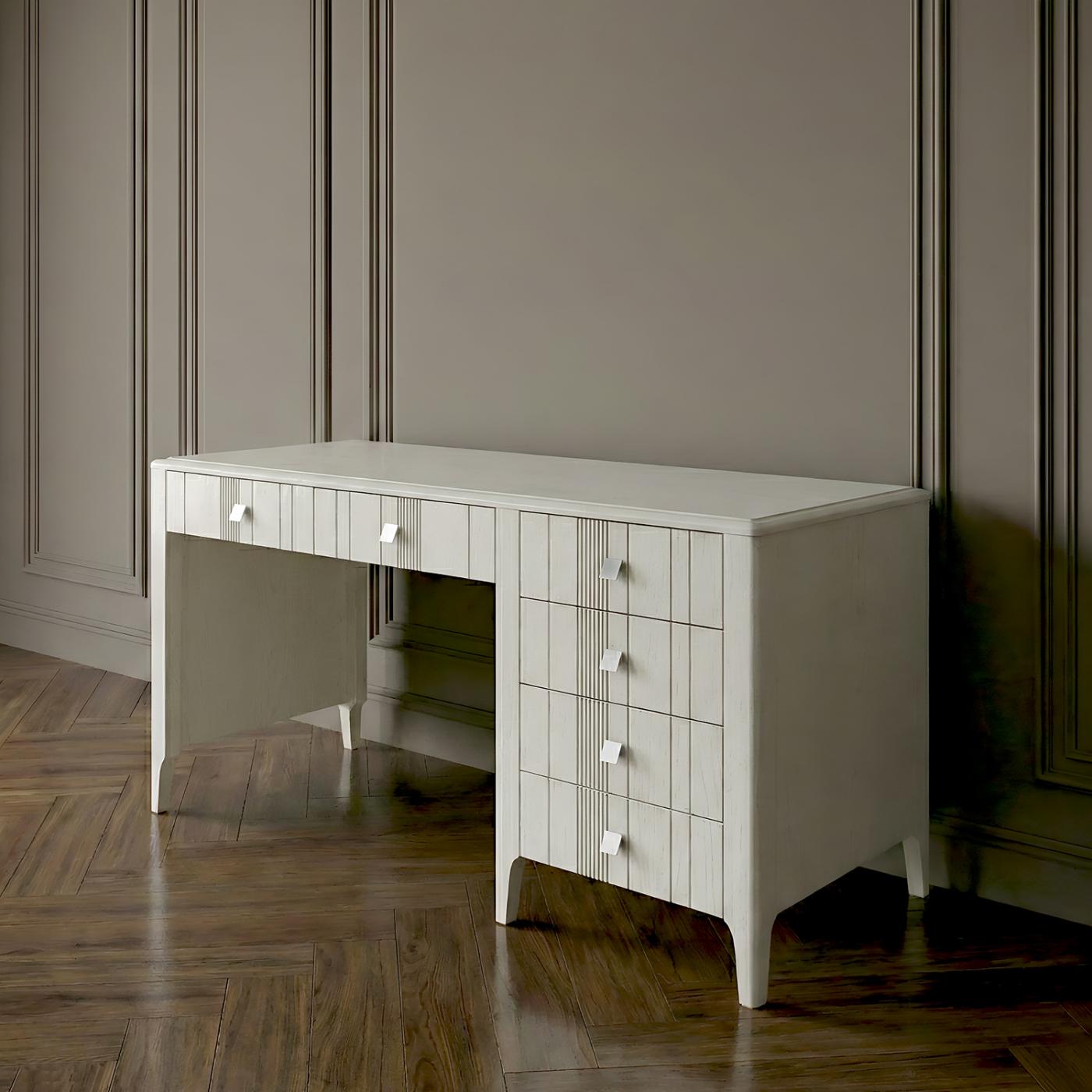 Стіл «Доміно» виготовлений із натурального дерева, тому прослужить довгі роки й витримуватиме великі навантаження. Для виробу підібрана якісна та дорога фурнітура, зокрема італійські квадратні ручки бренду Giusti. Покриття нанесене тонким шаром, щоб не приховувати красу дерева. Меблі пофарбовані та покриті лаком на водній основі від виробника Barpimo (Іспанія).