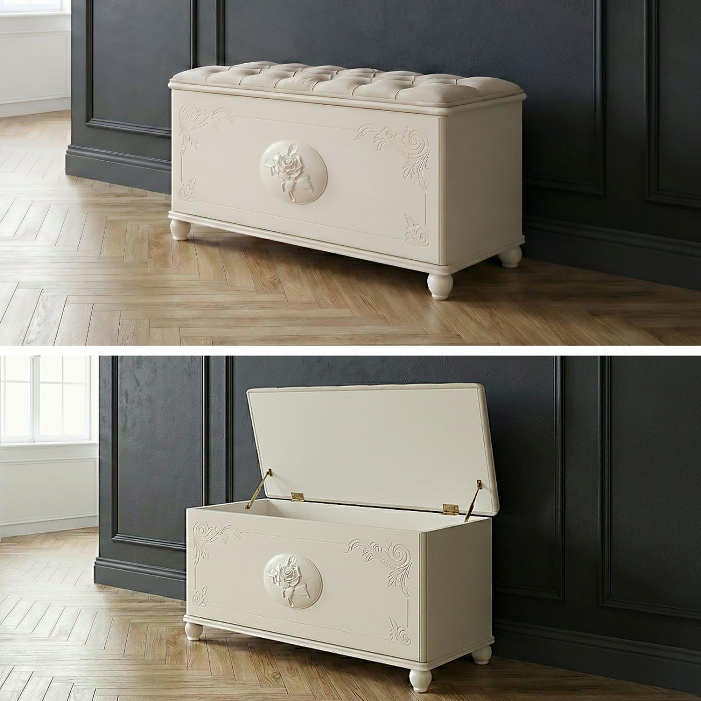 Сундук «Сиена-Конфети» оснащается открывающейся крышкой. Цокольная часть формирует небольшой подиум, что добавляет солидности, даже некоторой монументальности. Три ящика декорированы сложной филенкой. Верхний украшен орнаментом, он меньше остальных, предназначен для мелочей. Средний и нижний - более глубокие, могут выполнять функцию комодных ящиков. Дорогие металлические ручки сложной формы надежны и приятны на ощупь. Каннелированные боковые детали в сочетании со сложным профилем цоколя и крышки намекают на статусность предмета. Углы столешницы-крышки заботливо скошены, ушибиться о них сложно.