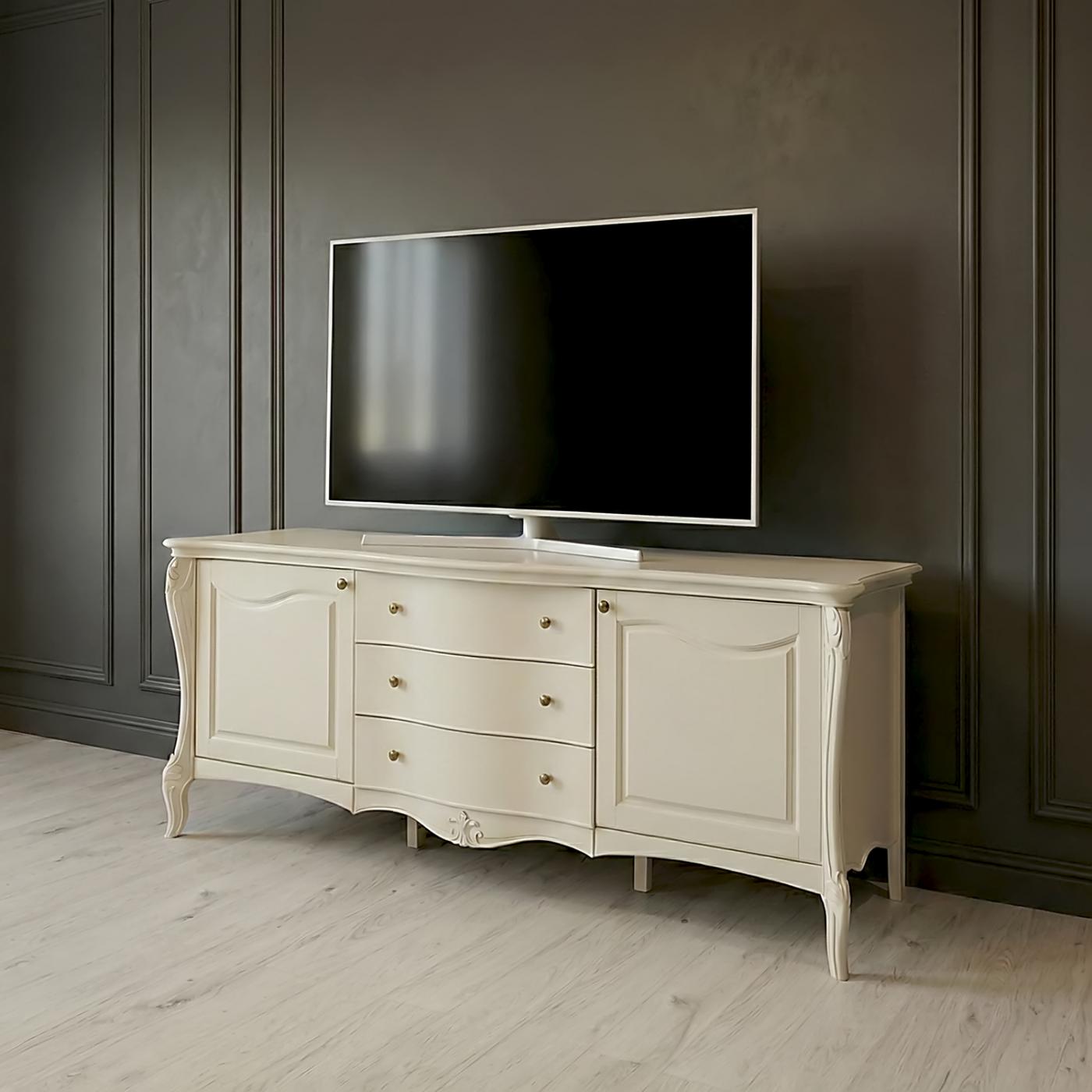 Вишукана тумба під телевізор «Валенсія» має гармонійний вигляд у спальні або вітальні з класичним інтер’єром. Модель із довжиною понад 2 метри чудово підходить для розміщення великої телевізійної панелі. До того ж тумба вміщує багато речей.