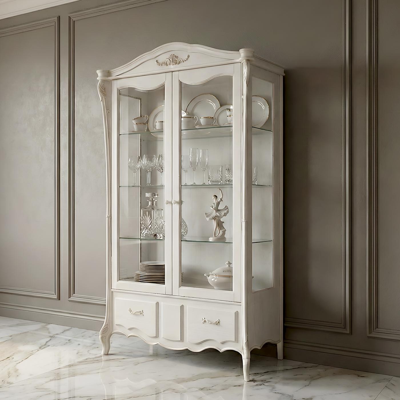 Особый визуальный магнетизм модели придает ее уникальный архитектурный силуэт. Дизайнеры отошли от привычныхпрямых линий, предложив деликатно изгибающуюся оригинальную форму фасадов, создавая сложную игру света и тени. Каждый элемент резьбы - это результат искусной работы, где классические мотивы барокко переплетаются с современными требованиями к качеству. Изящные узоры на дереве не перегружают пространство, а наоборот - подчеркивают естественную красоту волоко ясеня, делая витрину центральным объектом любого интерьера.